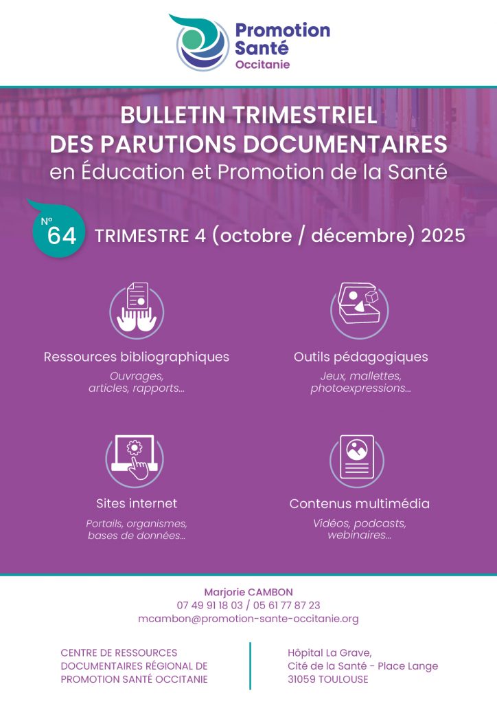 Le bulletin trimestriel des parutions documentaires de Promotion Santé Occitanie a pour vocation de vous signaler et de vous donner accès à des ressources bibliographiques, pédagogiques et des contenus multimédias accessibles en ligne dans le champ de l’Éducation Pour la Santé et de la Promotion de la Santé (EPS/PS), ainsi que sur des thématiques de santé variées. Il capitalise les résultats d’une veille qui n’a pas pour ambition d’être exhaustive, mais de repérer l’essentiel des nouveautés documentaires à connaître en EPS/PS.