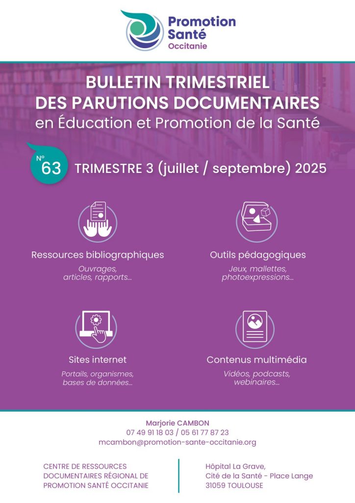 Le bulletin trimestriel des parutions documentaires de Promotion Santé Occitanie a pour vocation de vous signaler et de vous donner accès à des ressources bibliographiques, pédagogiques et des contenus multimédias accessibles en ligne dans le champ de l’Éducation Pour la Santé et de la Promotion de la Santé (EPS/PS), ainsi que sur des thématiques de santé variées. Il capitalise les résultats d’une veille qui n’a pas pour ambition d’être exhaustive, mais de repérer l’essentiel des nouveautés documentaires à connaître en EPS/PS.