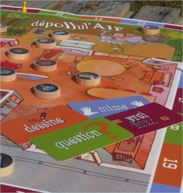 Ce jeu de plateau est dédié à la qualité de l’air intérieur et de l’air extérieur, destiné à un public à partir de 7 ans, en équipes de 2 à 5, composées de 4 à 30 joueurs. L’objectif du jeu est d’assainir l’air de la maison et du jardin en retirant les sources de pollution présentes sur le plateau, par des activités “question”, “mime”, “dessine” et “vrai/faux”. Il favorise chez le joueur l’adoption de gestes quotidiens favorables à la santé ainsi qu’à son environnement. [Résumé Bib-Bop]