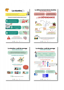 Cette exposition a pour thématique la nicotine. Elle présente de façon ludique, sur 4 panneaux A3, le fonctionnement de la nicotine dans le corps, le détournement de la nicotine par les industriels du tabac ainsi que son utilisation dans le milieu de la santé comme outil de sevrage.