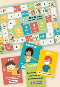Ce jeu de l’oie, crée dans le cadre de la pandémie de la Covid-19, permet d’intégrer les gestes barrières pour se protéger et protéger les autres. Il propose 4 types de cartes: cartes OUPS pour détecter des situations non conformes aux gestes barrières ; cartes BONJOUR pour proposer par le mime des alternatives au salut ; cartes SITUATION pour réfléchir à l’attitude à avoir dans une situation à risque ; cartes DEFI qui proposent un défi à relever.